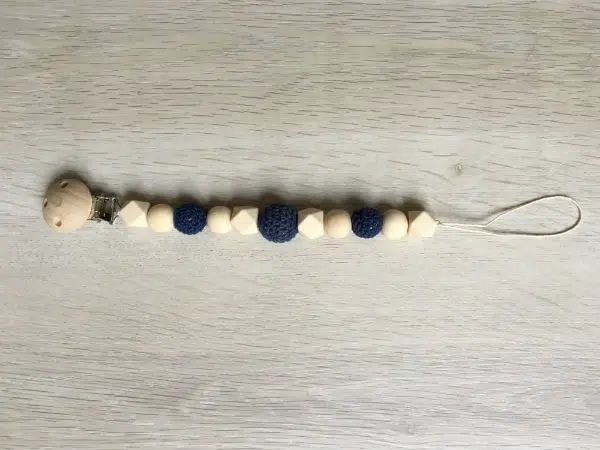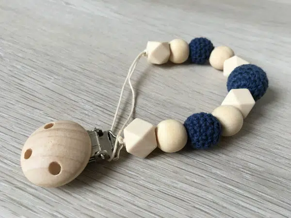 L’attache sucette Ronda bleu marine est un attache sucette sensoriel original composé de perles en bois brut, de perles en bois et tricot, et de perles en silicone alimentaire. Ses différentes textures permettent d’éveiller les sens de bébé.