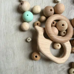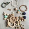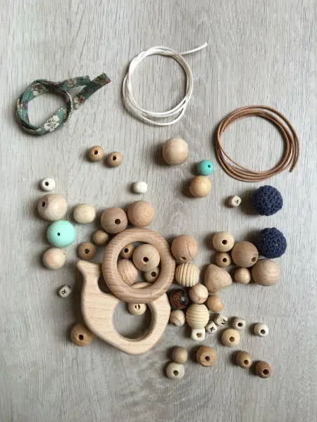 Vous y trouverez différentes perles en bois de hêtre naturel, différentes tailles, différentes matières, quelques perles en silicone ou encore en crochet, parfois quelques formes en bois, mais aussi des fils, en cuir, en liberty ou autre.
